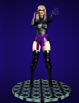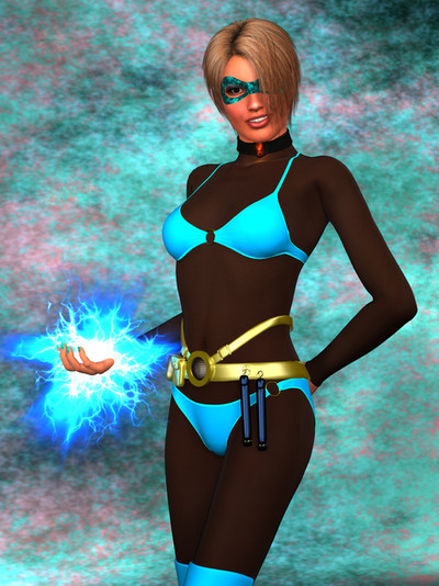 Now for a bit of work for Lada97, who has requested a superhero vs. villainess scene with bondage overtones. This was the villainess I came up with, but I feel the Azure Wraith as a name just doesn't strike fear into my heart. I welcome any suggestions for a name for her. She manipulates the electricity in the air in order to create anti-fluidic molecular bonding that in turn produces a powerful surge similar to electricity but that is mostly non-conductive. You can check the science on that one, and while you are at it see if penguins do indeed migrate to the North Pole via flight.This character was rendered in Daz. I used BD Hilde as the base character, managed to restrict myself to no tattoos, and then had a grand time shading AF's Catsuit. I think the dominatrix look suits her well, and the thought of her getting carried away and "accidentally" giving her partner an extra jolt seems to be in character for her. The background was from Nemesis74's Alien Skies with lots of blue added and I used a sky HDRI for lighting to give it sorta an outdoor look. Anyway, hope you like!