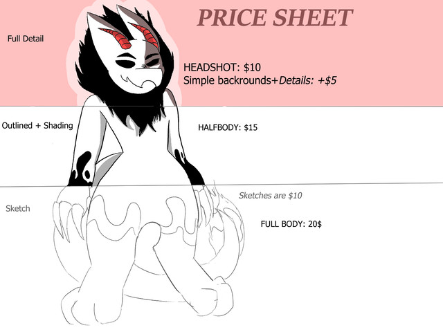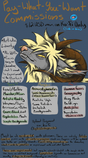 Hi, I've been on DeviantArt before, but I'd like to start over with a more professional account. This right here is my commission sheet! I plan on opening every once in awhile, and my tagline will be my commission status.Things I WILL do at the moment: