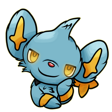 Japanese Name: Kolink, コリンク (Korinku)Shinx is a quadrupedal, feline Pokémon resembling a lion cub or lynx kitten. Its front half is light blue, while the rear is black. There is a short tuft of fur on its head and smaller tufts on each cheek. The top tuft is smaller on the female Shinx. It has large, oval ears with yellow, star-shaped markings on the insides, yellow eyes, and a tiny, red nose. Whenever its mouth is open, small fangs can be seen in its upper jaw. A black marking encircles Shinx's neck like a collar, and there are yellow bands above its forepaws. The hind paws are black on the male Shinx and blue on the female. Spiked fur surrounds the base of its long tail, which is tipped with a yellow star shape. The fur can glow when electricity is used.