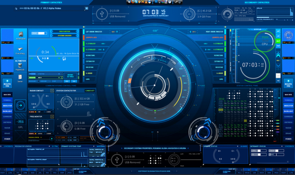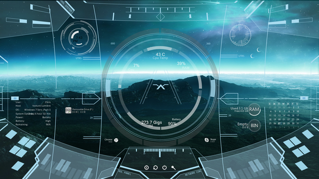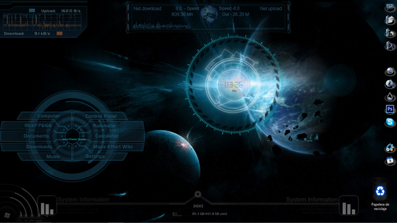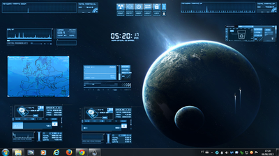 Rainmeter which is all the clocks and things all over my wallpaper I'm using BlueVision V0.2 Alpha by [link] , Starview by [link] and Space which came in the pre installed stuffs I thinks x__x if I'm wrong lemme know and I shall change this! But all the clocks, bars and circles stuffs move ect even though it's kinda draining on teh ram but is okay as i have 10gb of RAM