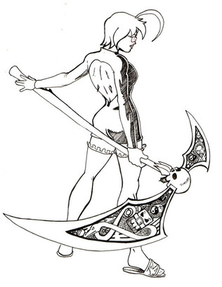 hey..hope i have not asked before..if so slap me silly but....i have to say i dont draw as often as i should as..well no reason i just dont...how much time do you usually spend drawing a day i mean im always amazed at the amount of decent material you do manage to put up!!! ahhhhhh ...man and this is so reminding me of Alita....maybee because of the hair..and the body too...hmmm nice one!!!!!!! love the weapon too wish i had one of them to make sure my Enimies didnt mess (ok by enimies umm i dont mean people like "the penguin" or "the joker" i mean people like the guy that seems to try and stuff pieces of paper into our house everyday, and the paper has my families names on, even mine some times ahhhh)