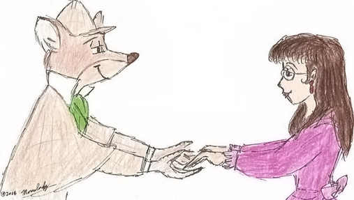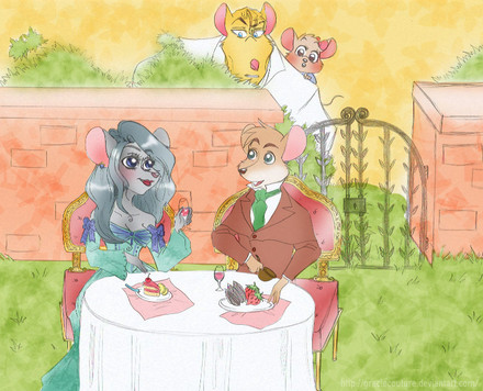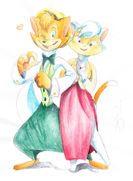 This is really sweet! Your traditional drawings are amazing! I love how you blend the colours, especially Basils ascot. The background is SO pretty, and I really dig everything about this! Miss Kitty is cute as heck, and I love her eyes; I really dig how you kept her all in blue!