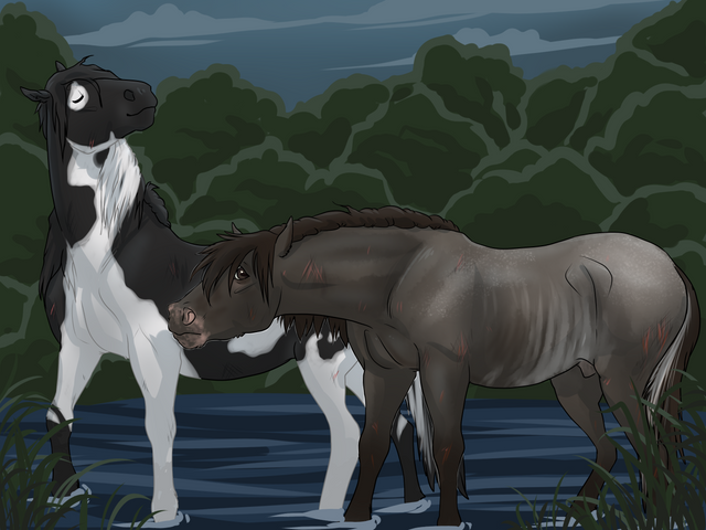 A long, winding river cut through the stream. She spotted three pale figures who lingered around the muddy banks. She wanted to cry out and ask for help, but before she could, the stallion let out a greeting call. The two figures raised their head, whinnying back. Dread filled her limbs as she realized that these mares were his. He snaked her along until she reached the other mares, where he finally allowed her some space. Muertos considered making a break for it, but exhaustion hung heavy on her shoulders.
