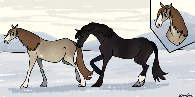 Anger flared up in the fiery stallion and he scrambled to meet the black stallion before it was too late. He skidded to a halt over the young colt and reared up in anger, striking out at the air. Caine let out an indignant squeal and shook his head.