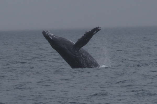 After 4 hours of searching for some humpback whales in pretty rough waters around Puerto Lopez in Equador, this mother whale surprised us by jumping up only 150 feet from our boat and giving us an old fashion splash-welcome in her "house"....With its Latin name, Megaptera novaenglieae, meaning "long winged from New