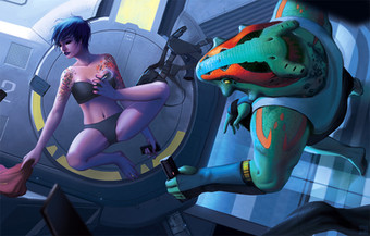 farbwahl is total passend, es wirkt durch die braunen und beigen farbtöne einfach total natürlich und normal, ruhig, entspannt, während die kleinen technikdetails wie der suit der netten gutaussehenden dame und die techniksachen im background das scifi thema unterstreichen. auch die zaunelemente oben und rechts am rand find cih ttoal klasse, das gibt richtig athmosphäre. für die runterhängenden kabel das gelcihe; alles fügt sich nahtlos in den gesamteindruck ein, was mir wirklich gut gefällt.