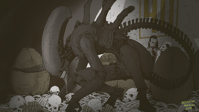 This is an amazing drawing, the tones and scenery are very authentic. I love how oblivious the unfortunate astronauts seem to be, while the Xenomorph is blending in very well with its mechanical surroundings. You even included the human skull within its heads, which is very chilling and not often depicted by other artists.