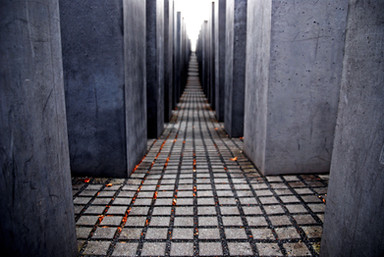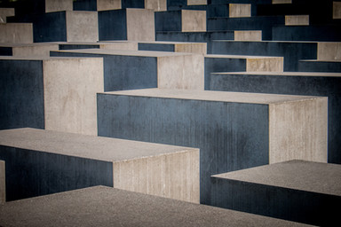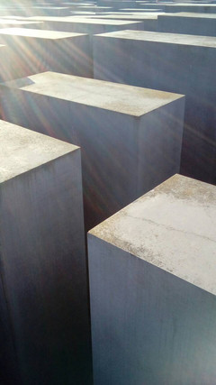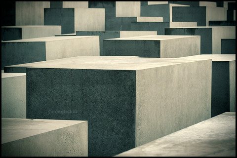 "The 19,000 square-meter Memorial for the murdered Jews of Europe, which was opened to the public on May 12, 2005, consists of 2711 stones placed on sloping, uneven ground in an undulating wave-like pattern, giving visitors the feeling of insecurity as though the stones were on unstable ground.Visitors can enter from all four sides, day or night, and wander on their own through the maze of stones, as though visiting a graveyard with nameless tombstones. The columns are sunk into the ground to various depths and at some places, they are higher than the heads of the visitors. There are no set paths or sign posts to guide viewers. The memorial was designed by architect Peter Eisenman to deliberately disorient visitors by having all the stones tilted slightly and paths that are not level."