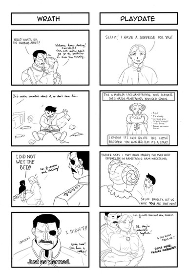 Quite a lot had changed within the eight years since she'd last seen the Crown Prince of Amestris, the most obvious being that Selim was no longer a little boy. Mei could not help but notice that fact.And Queen Amestris still smiled mysteriously at them, though now she shared those secret smiles with her husband. The queen's consort, Sir Bradley, now made it a habit of pulling 'kissy-faces' at them both during meals, much to the amusement of the Queen and to Selim and Mei's joint mortification.