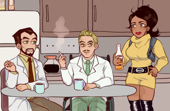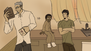 Hee hee hee. I love the amount of detail in your drawings and this one is just an overload in that regards. The nuts and bolts in the cupboard, the little cracks on Cid's mug - love it.