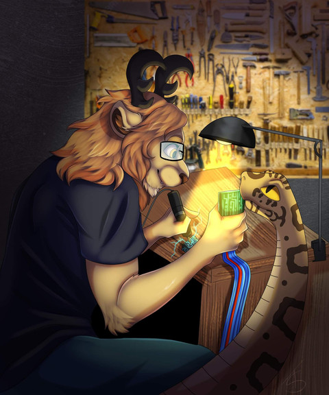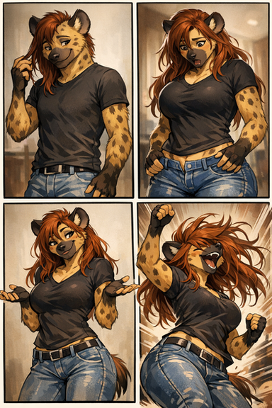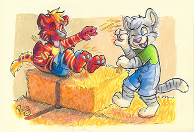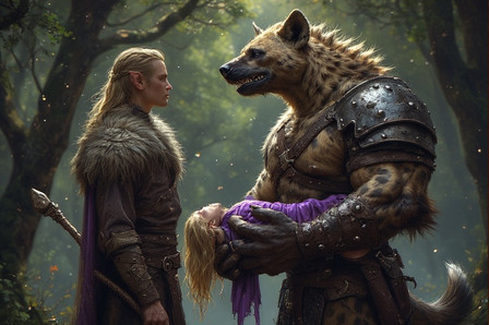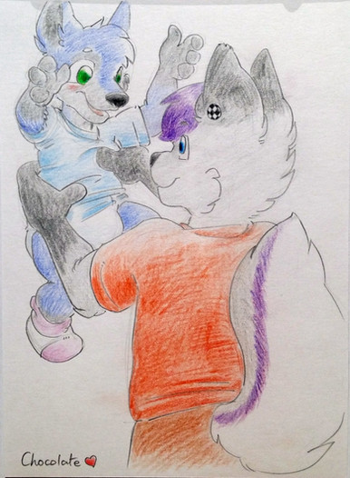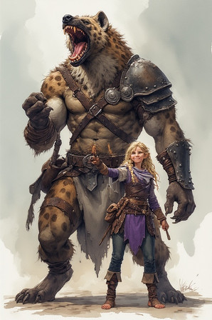 Yes, Miles has children. When I married him to my gnoll OC Min, he inherited her first twins Moria and Mordor. But it didn't take long for them to have another together. And her name is Morwyn. Miles dotes on her a lot, she is the second love of his life. She's about a year old now, and for a half-gnoll that is about the same as a four year-old. Miles loves every minute with her. Here she is dancing with Daddy.a delightful portrait by the talented traditional artist Β sanssouci