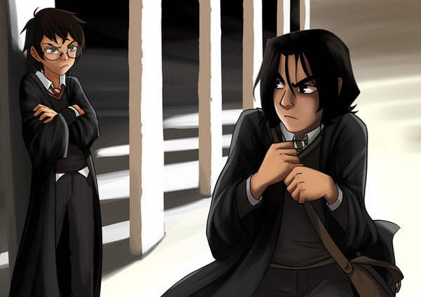 Although I love the drawing, I personally think that you do not understand the complex character of Snape. You are just seeing black and white (ie: "he was a jerk but he was brave") how does that sum up anybody?! If you actually looked at his character more in detail you would actually find that In the Prince's tale he was a very good friend to Lily and reassured her that being a Which was nothing strange and actually encouraged her to embrace her magical ability. Furthermore Sirius and James were horrible to Snape as soon as he set foot on the hogwarts express, they didn't know him then and they were simply judging him and bullying him because of "the way he looked". So your excuse of James being a "cocky 15years old" is invalid because obviously he was mean to Snape at the age of 11. Yes, Snape did call Lily a mudblood which is totally unacceptable, but Snape was feeling extremely vulnerable at that point and, being a 15 year old boy, wanted to show he could defend himself by his own. Yes, he should not have done it but if you are so willing to accept that James' years of bulling was just a "cocky stage" he was going through, how come you are not willing to accept that what Snape said was a big mistake that he obviously regretted immensely? After that moment I think the character of Snape changed completed, now that he didn't have Lily I think he felt the need to "belong" and therefore joined the deatheathers. Another decision that he regretted quite alot. As for his behaviour towards the "children", i'd like to say that here again you are seeing black and white. Snape was by that time a wartorn, heartbroken man, you just felt like being nice was unnecessary. I still see Snape as the weird little boy who was adorable to lily way before they went to hogwarts. In my opinion that is the real Snape and i think why is character seems so mean by the end is not down to him as a person but through what he has been through, what he has lost, his regrets and the people that made him like that and believe it or not, if it wasn't for James Potter, Snape would have have been a much nicer character. I am in no way trying to change your opinion of him i am just showing you how much deeper of a character he is.