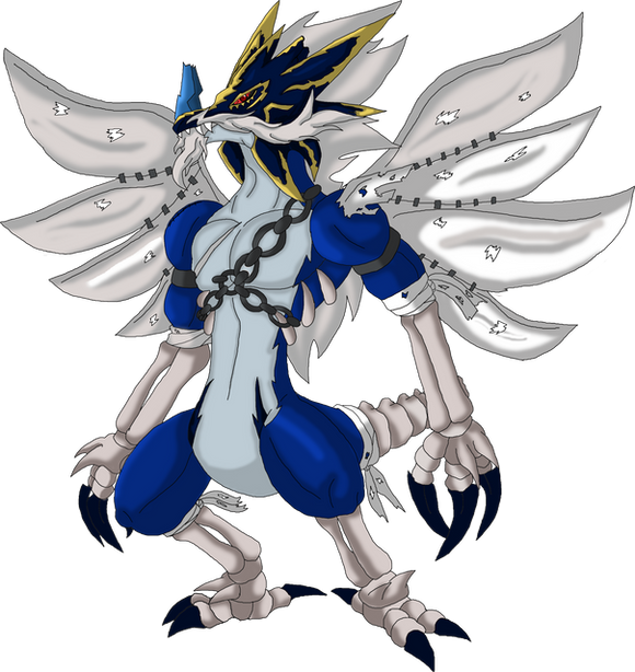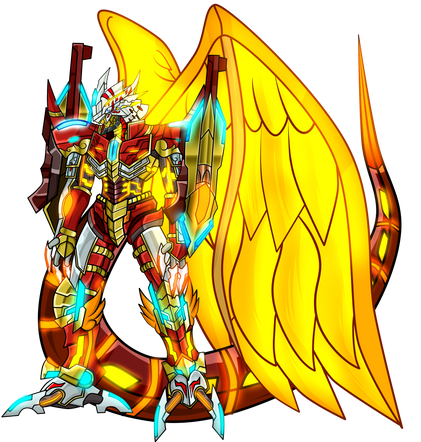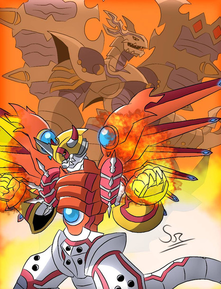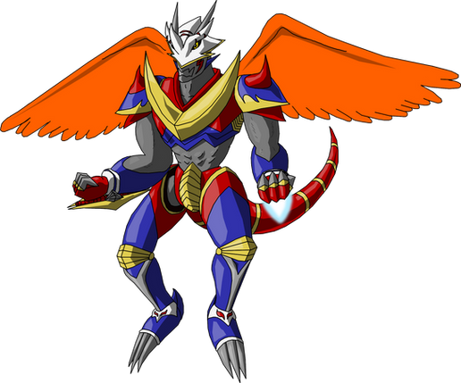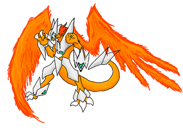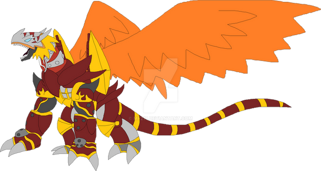 His adult form is basically this, but without all the jet armor and less flames. I wanted to show of that turbine thing Zhuqiamon has on his back, it's part of this design too, but the pose doesn't allow for it. >.<