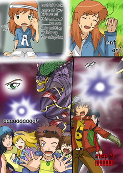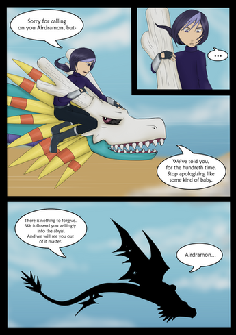 I know alot of people watch me because they're waiting on Monochrome Reign. Don't worry, it's coming. So don't be alarmed by this (this thing you see is going nowhere). For MR I still need (or needed?) to figure out how the page set up would be, and having the panels on what would be a white page with white speech bubbles seems like the way to go. It's more simple, looks more clean and looks more organized.I simply decided to play around with the page format using that Digimon design project I've neglected. You know, this project. [link] If all goes well it'll be a fanfiction for which I'll do illustrations for.