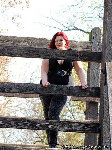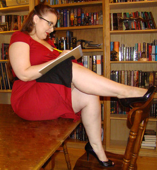 This was taken, well... in a library. Much like the Uncarved Block Gallery, I'm in my common clothes and unadorned on an average day. These photos came to be while I was waiting for props for my next horror shoot. I figured, "why not?" I've always wanted photos in a library.