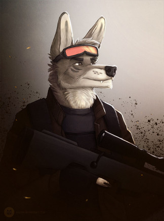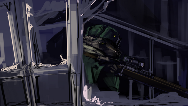 Been on a stakeout for months now looking for a guy who lives in that shattered building. Patience is bitter, but its fruit is sweet. A rendered fullbody of a hawkeye jackal sniper gal done for gabrielofcreosha .