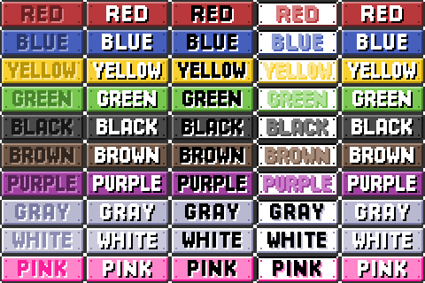 This tiny spritesheet is used in Q.Qore (Summary Screens) to represent Pokémon's Color. Per form color is also supported (Such as on East Sea Shellos). Entirely contributed by me. Has five Style (Color Text, Light Text, Dark Text, Egernal White and FRLG)