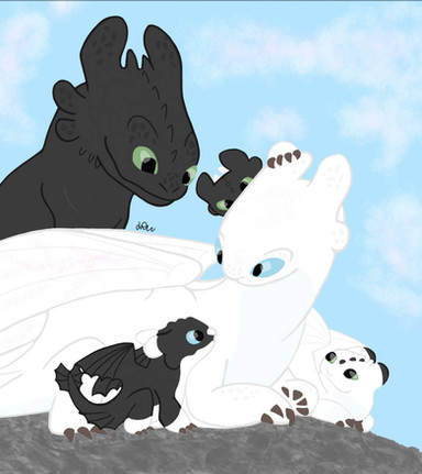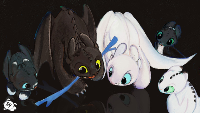 Our favorite Alpha and his family in the Hidden World.Toothless, Light Fury & Night Lights (c) Dreamworks