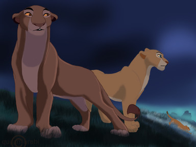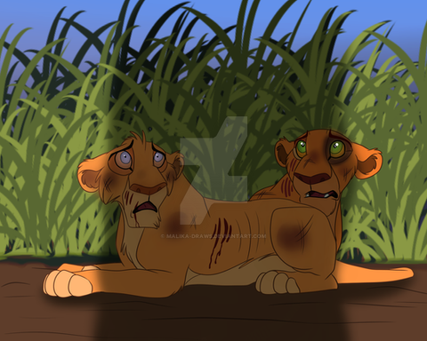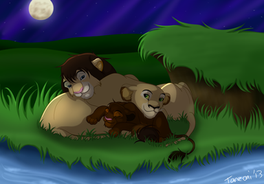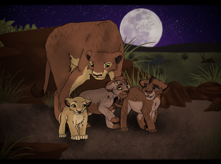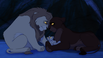 The Pride Rock family found a little cub in the Outlands, next to the bodies of two felines. A lion and a lioness. The cub seemed to unharmed but the emotional scarring was incredible. He whimpered against the lifeless bodies of the lioness, shivering with fear when the large brute approached. "No need to be afraid little one. I won't hurt you" He whispered, smiling kindly. The cub shuddered and stared up at the male with wide eyes. "Hon, let me" Another lioness whispered. She came closer to the cub, lowering to his level. She smiled kindly, but the cub ducked away behind the dead lioness' leg. "Don't hurt me!" He exclaimed. "Shh, shh. I'm not going top hurt you, little one. Come out out." She whispered. He peered around the dead lioness' leg and blinked. "Come on... Come on out." She smiled. He hesitated for a second before stepping forward. His eyes were red and swollen from crying. "That's it. Come here." She said, laying down. "You must be freezing." She whispered. This indeed was true. It was the middle of winter and he was ice cold. He slowly, hesitantly, walked into her fore paws and shuddered. She held her close and started to lick his pelt. "What happened here?" The male asked. "They killed them... They killed them both" He whimpered. "Who sweetie?" The lioness asked. "Hyenas" Is all the cub was able to say before bursting out in tears. "Hey, shh. It's okay. Shh" The lioness whispered. "Mama... Papa... I'm sorry" He whispered. The lioness' eyes shit up to her mate and sighed. He only nodded and sighed sadly. The lioness smiled softly and licked his head. "Don't worry little one. We'll take care of you. What's your name?" She asked quietly. "A...Ahadi" He muttered. "Nice to meet you Ahadi. I'm Nadari. This is my mate, Mohatu and our daughter, Uru" She smiled, looking back at the male and the little cub hiding behind his fore paw. She peered around his paw and blinked shyly. "H...hallo" She whispered, slowly walking closer to him. He looked away and swallowed. "Come on. Let's get him home. It's getting dark" Mohatu said. Nadari nodded and smiled down at Ahadi. "Come on. Let's take you home" She smiled, nudging him up. They walked through the outlands, Uru staying close to Ahadi all the way. "Don't worry Ahadi. You're not alone anymore. I can tell, we're gonna be best friends." She smiled. He only looked away and sniffled as they walked on. Uru's face dropped and she sighed, looking at him sadly.References were used!!