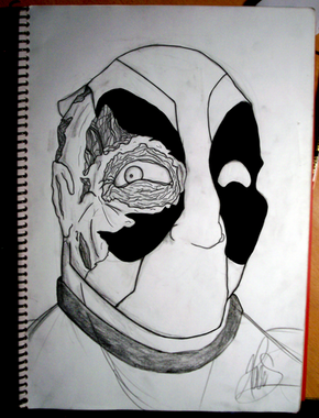 A drawing I made for my nephew. I kinda feel proud of this (actually the real version looks better than the crappy photo shot). He liked it so that's all I need to know... it's a shame that his favorite super hero is Deadpool... damn.I used the cover of a book I have that compiles several comics of Batman, the thing is that I have no idea who drew the original since inside the book there is no info regarding the cover art. Shame.