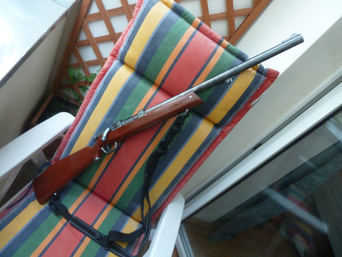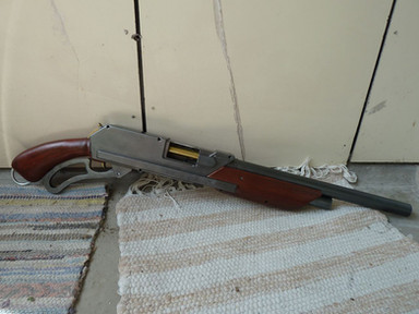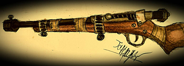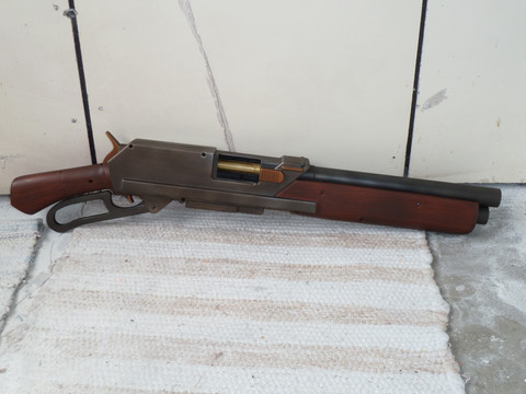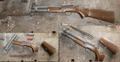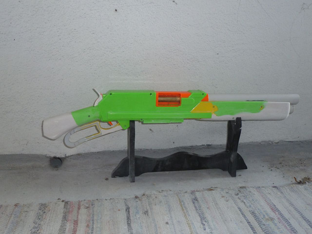 A post-apocalyptic Buzz Bee Rapid Fire Tek, fitted with a homemade peep sight, a breech-fed RSCB, custom stock, modified lever and barrel extension. Note the tally on the stock and the welding seams. I am really happy with this thing - hope you like it, too. It will find its way to my customer today or tomorrow. Criticism and feedback is always welcome!Related content