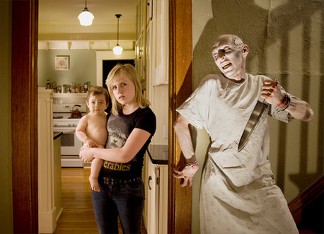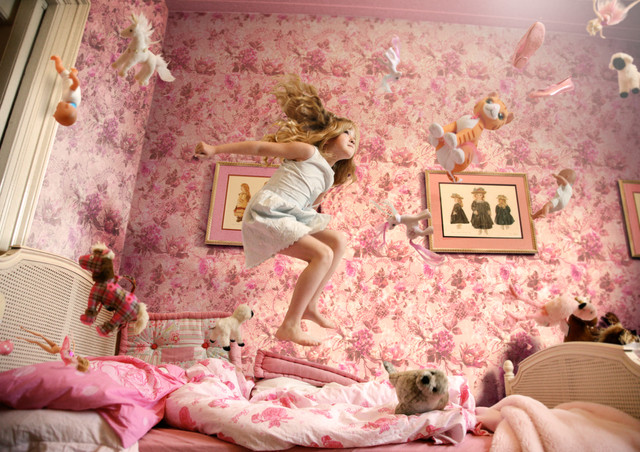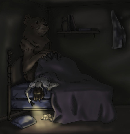 The blocks on the floor spell out who the monster is under the bed...Daddy...great photo depiction of child abuse