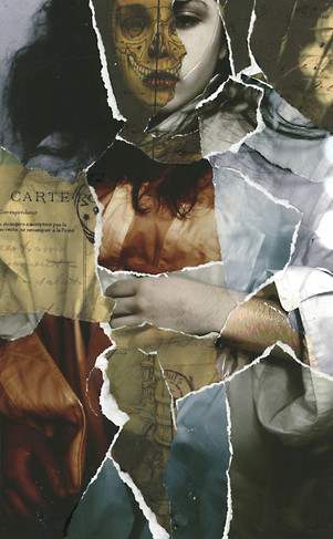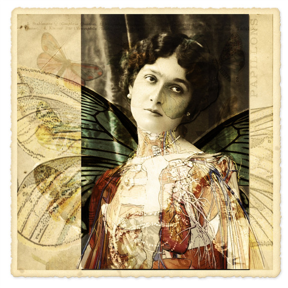 Two layered transparencies of a vintage portrait and an anatomical diagram (Skeleton first manipulated in Photoshop to make it fit)