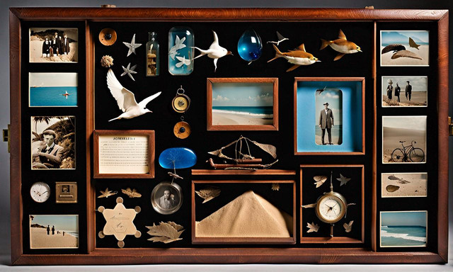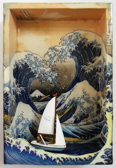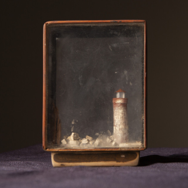 Shadow box / diorama in a vintage toffee tin 3.5 x 5" (1 " deep).Paper, acrylic glazes, vintage watch parts, shower sponge netting, tinted resin.