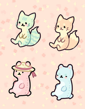 my bf and bo have our like main 4 oc, and we kinda just go by color for them mostly when drawing lil doodles and then ofc they have their furry animal selfs so from left to right is kai, bijou, mira, and brady