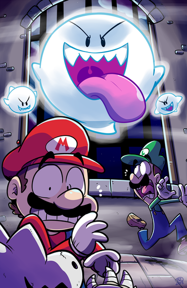 Lately I've been on an artist block... Well this block is mostly affecting my pinups, so I decided to take a break from drawing girlies.I decided to draw my FAVORITE PLUMBERS running away from Boos and the BOOHEMOTH!!