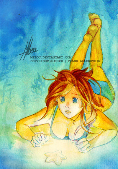 You managed an incredible goal in colour contrast. There's a lot of blue there but it's a very warm piece too. Also like that wet sensation in her hair.