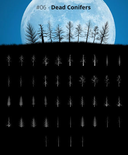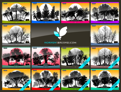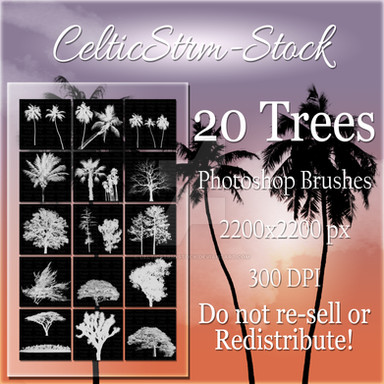 Brush pack for Photoshop CS and higher (see below for PS7 version). Contains about 40 highly detailed tree brushes, rendered in Vue Professional 4.5 :