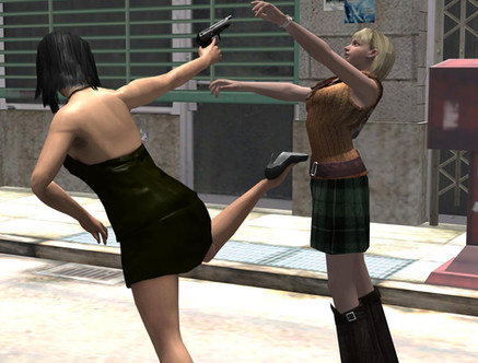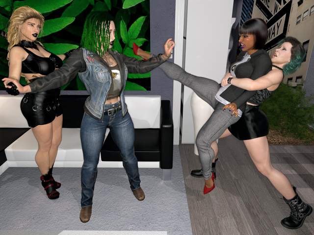 It looks like the blonde is trying to get back up on her heels. Whether that's because she wants to get back into the fray or make a tactical retreat, I'm not sure.