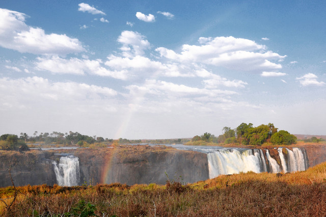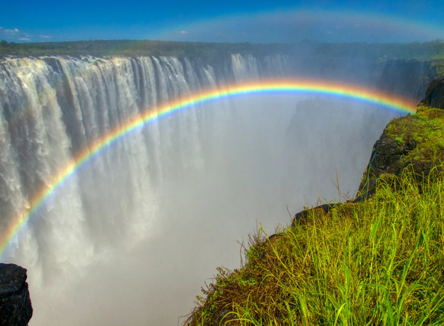 Afternoon sunlight paints a massive rainbow in a rainstorm falling over an already flooding Augrabies falls...notice the person on the viewing deck bottom right and you'll get a sense of the scale of these amazing falls