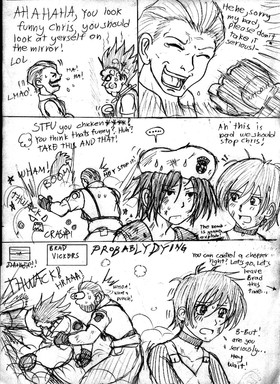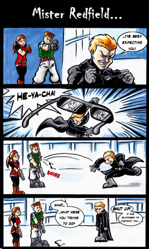 I love this comic! Your drawing is incredibly cute. lol, I had some trouble with timing button presses too, especially during that scene. Still, I ended up letting Leon die on purpose several times, just to see the death cutscene xD. Although the knife fight is a pretty illogical way to try and kill each other, you've got to admit, it sure was pleasing to watch.