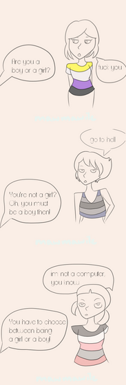 A genderfluid, a Bigender and a Non-binary person want to go to use the restroom....problems ensue.