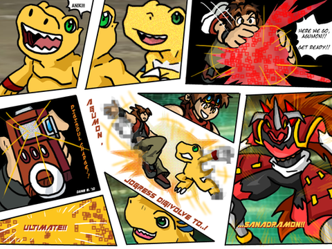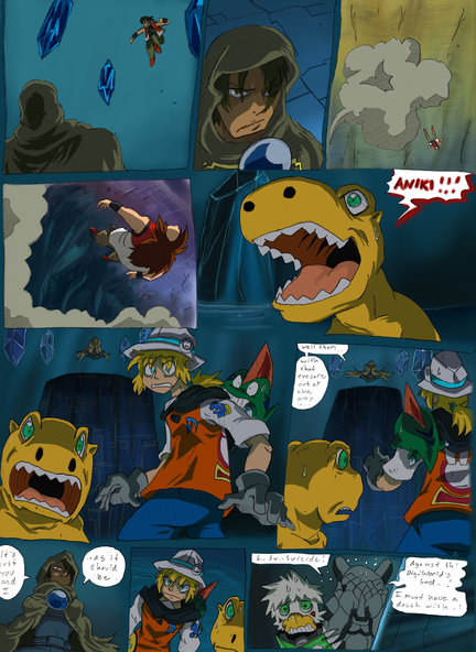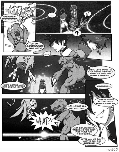 I lol'd at Theldy and Veemon when they fell from the vent! XD And somehow I imagined Gabumon screaming like a little girl from that intrusion.