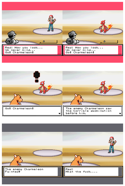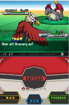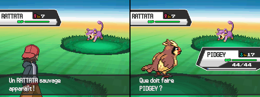 I've decided to use backsprites from Black & White since they're nice, small enough and for the first time, contain the whole Pokémon. I use sprites from Silver and sometimes Gold (depending on the posture I need) for the opponent, though. Also pseudo-3D background, because plain white is boring, and I thought any battle screen from the games wouldn't look good anyway. This is actually close to the battle screen from B&W, only without the HP bars.------