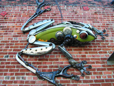 I just finished this frog sculpture as a commission. It's all old car hubcaps collected from the side of the roadRelated content