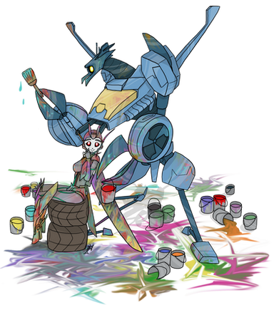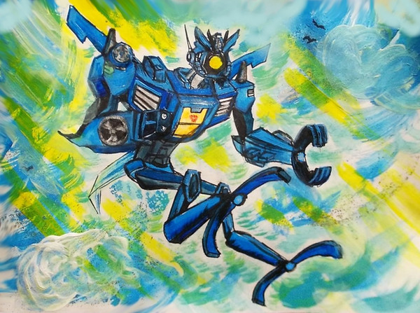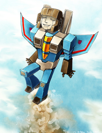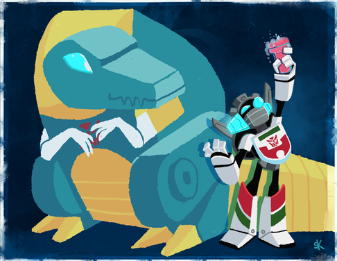 Not only is this cute & embodies the awsomeness that is wheeljack. I loooove the use of your textures & combination of mediums in this. (and the little dinosaurs <3)