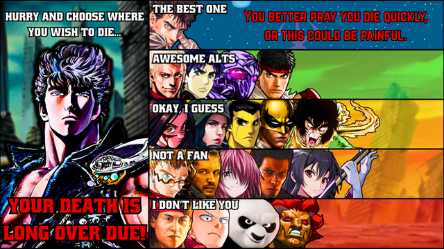 I Don't Like You: Noob Saibot (Mortal Kombat), Iori Yagami (King of Fighters), Ganondorf (Legend of Zelda), Scorpion (Mortal Kombat), Wolf (Star Fox), Doomfist (Overwatch), Iron Fist (Marvel Comics), Boros (One Punch Man), Juggernaut (Marvel Comics)