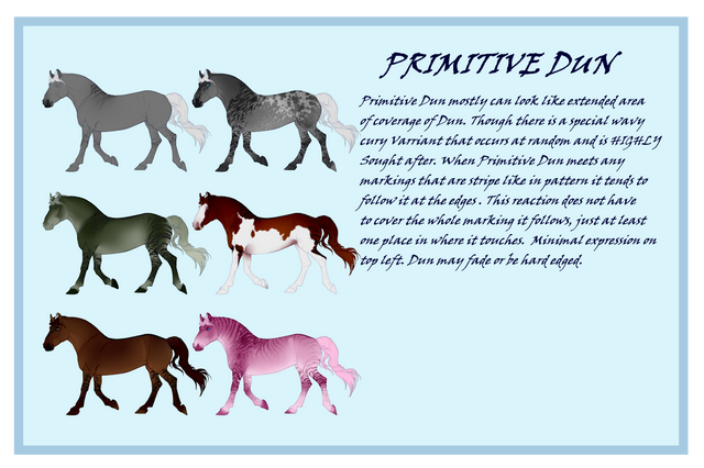 Dun - nD or DD - The Dun gene is a dilution gene that affects both red and black coat color pigments. The gene is associated with "primitive marking" and has the ability to affect the appearance of all black, bay, or chestnut ["red"]-based horses to some degree by lightening the base body coat.