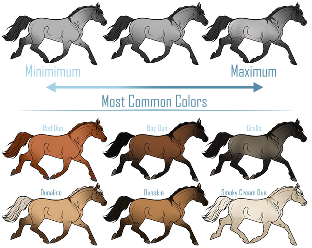 The dark stripe down the middle of the animal's back is the most recognizable marking associated with Dun horses. Other markings include a tail and mane darker than the body coat and usually darker faces and legs. The classic Dun is a gray-gold or tan, characterized by a body color ranging from sandy yellow to reddish-brown. Depending on other underlying genetic coat color factors, a Dun horse may appear a light yellowish shade or a steel gray. Manes, tails, primitive markings and other dark areas are usually the shade of the non-diluted base coat color.