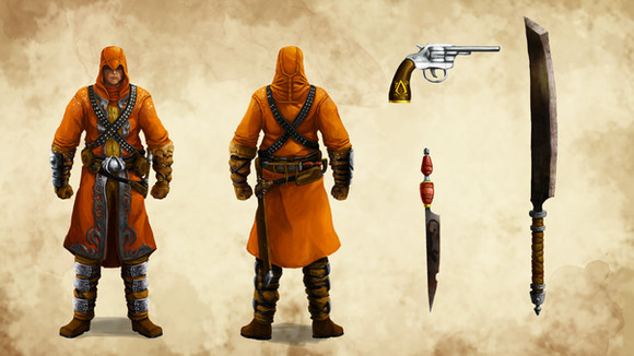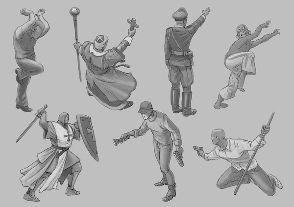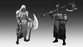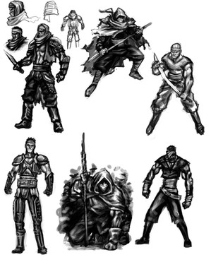 The three figures as an exercise. Concepts of hypothetical characters, no specific project. From left: Bandit, Neuromant, Watchman. Done in Photoshop.Related content