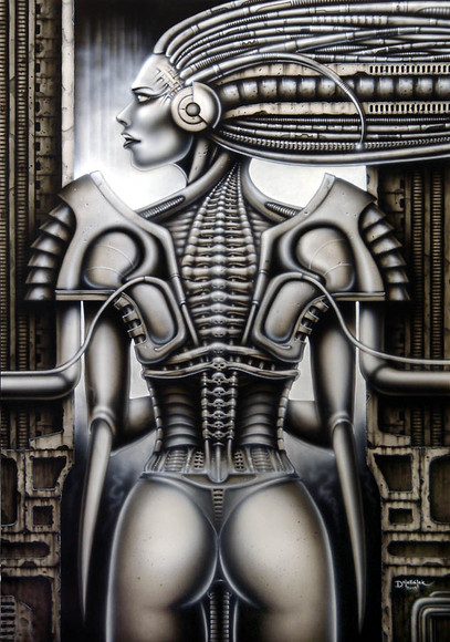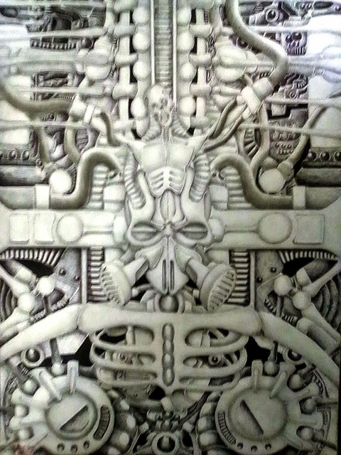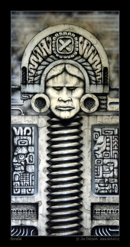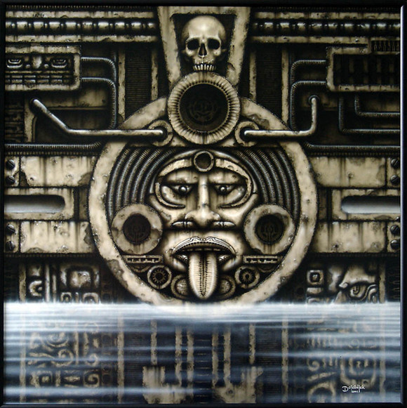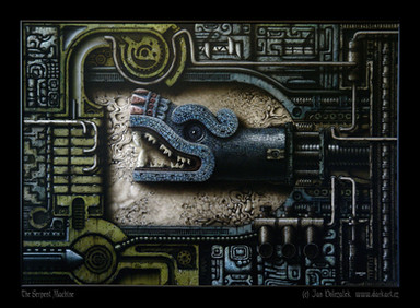 This artwork is from my sequence - Ancient mechanic of Central America. This work is old, many things on this I make differently today. Central motive is Chaac Mool, famous character od Mayan temples and buildings - I was inspired by one of them in Chichen Itza. So, artwork is created by airbrush, only by three colors - two kinds of black and white. Desk is 70x100cm large.Related content