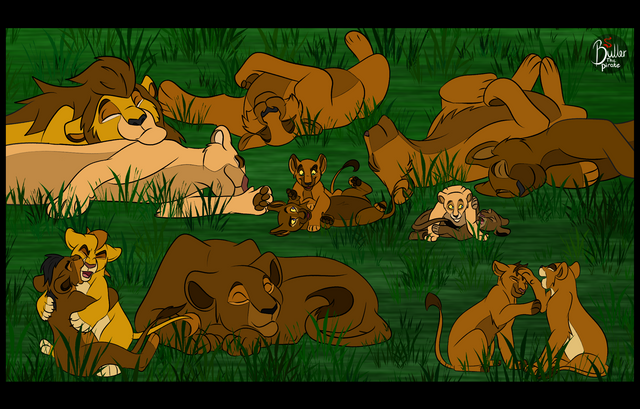 The finished product. Sarabi, Sarafina and Sobana enjoying a relaxing day in the grasses with their cubs.I'd like to say the background took me five minutes, but even this monstrosity took about half an hour.
