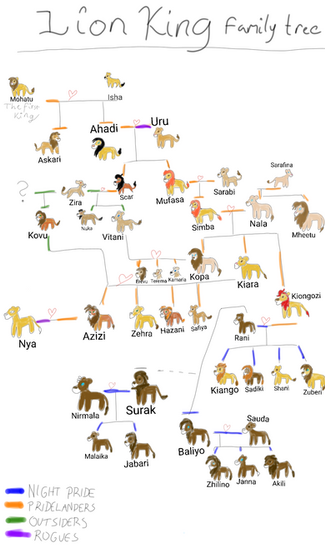 Here it is, a practically full family tree of all the characters from "The Lion King" and "Simba's Pride" plus my creations from "Homeland" and "Heart of a Mountain".