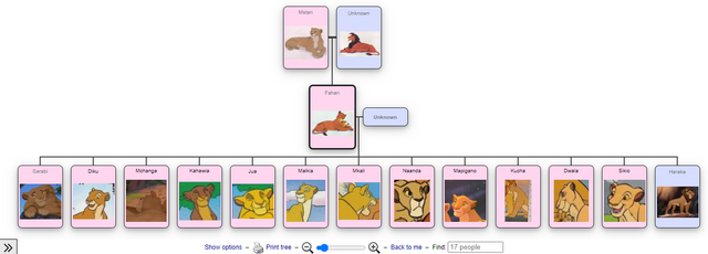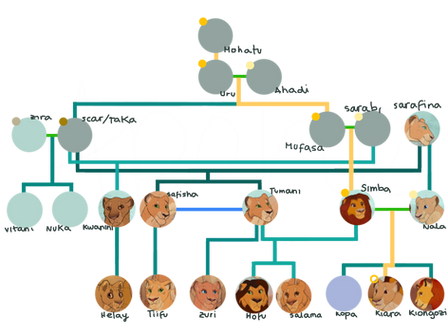 Each line also corresponds height wise laterally to the time the birth occurred i.e. you can tell from the family tree that Simba is slightly older than Nala, but Nala is only just older than Kula and Chumvi.