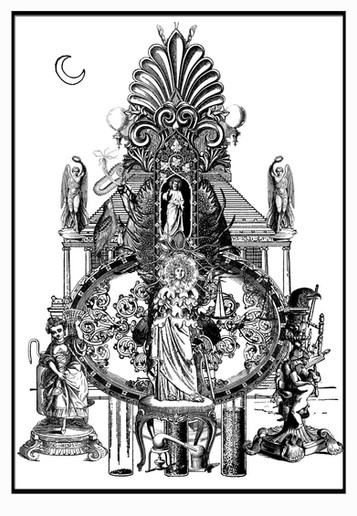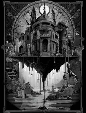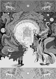 It is a chilling portrayal of a world on the brink of cataclysm, where the boundaries between myth and reality blur, and the very essence of human existence is called into question.Two ancient columns, worn by the sands of time, stand sentinel to this unsettling tableau, facing each other as if guarding the secrets of this unholy place.