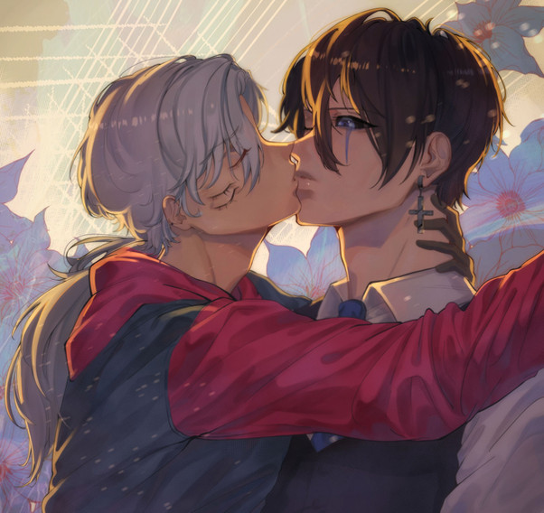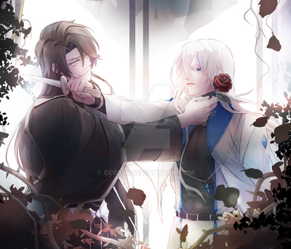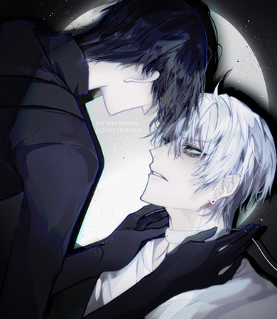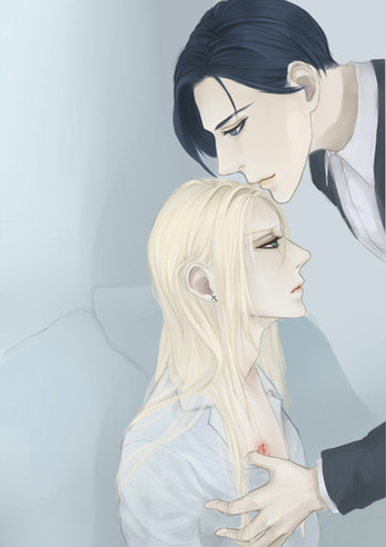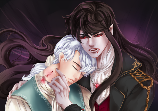 Miguel and Alfonse are both vampires. They are brothers only in the sense of comradery carried over from their days as angels. Miguel is a vampire that cares for humans, but is unable to stop until his victim dies once he starts feeding. Before meeting Al, he would only hunt those that are magically inclined (hence able to fight him off). Ever since making a deal with Al, he has been using the other as an alternate blood source, finding that he was perfectly able to control himself because the blood was much less potent. That's one aspect of their relationship aha-- xD --- which in truth is much more complex, and I try to express that with text where it could be a sign of intimacy, but also have negative connotations depending on context. Their character dynamics are amaze and I definitely look forward to exploring more ahhhh <3333 Please take care of my derp bby, momo. lakjsdfklja
